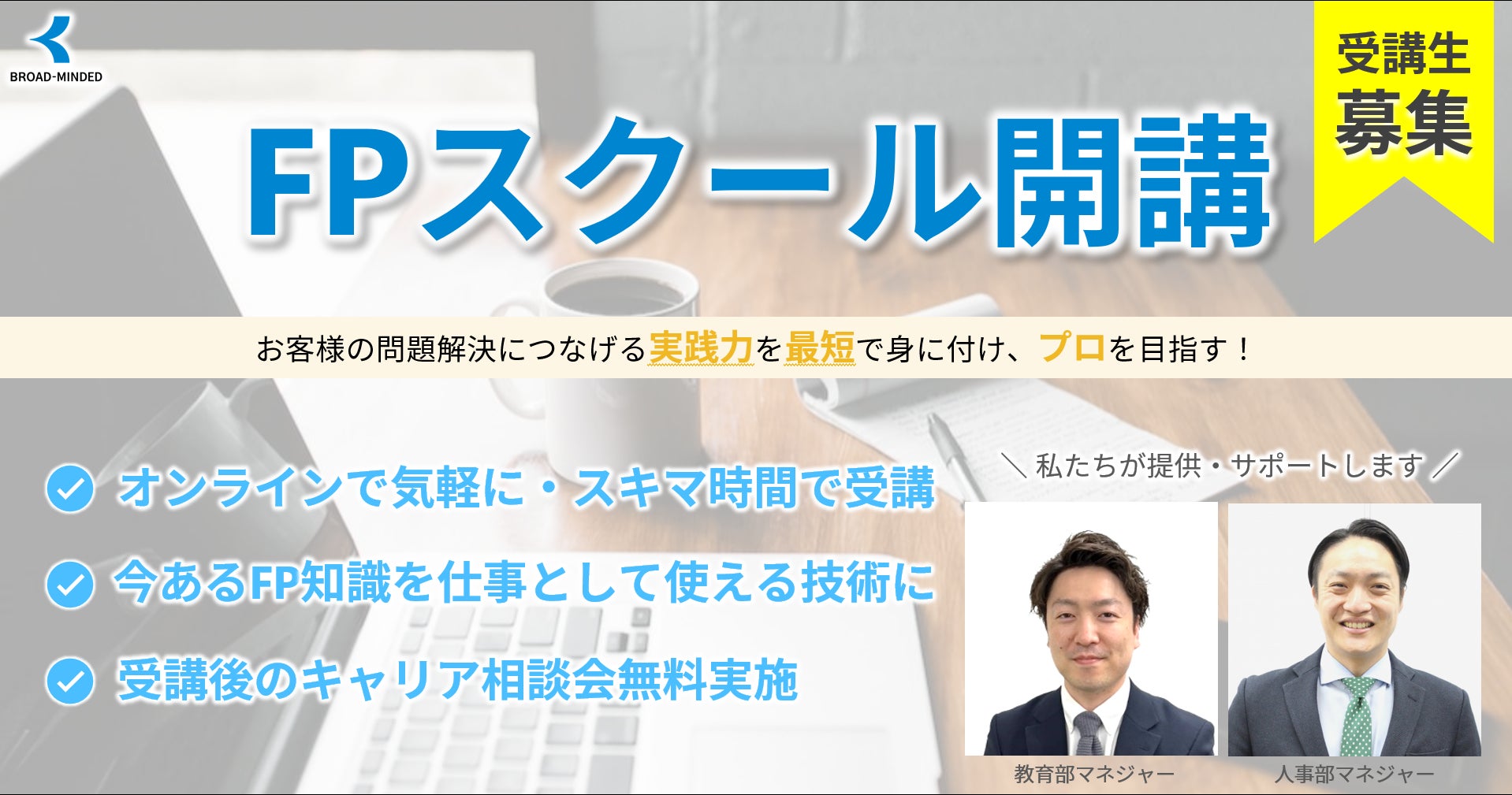 「金融の力を解き放つ」をパーパスに掲げ、保険・証券・住宅ローンと複数の金融商品を横断して1社で取り扱い、人々のライフプラン実現をサポートするブロードマインド株式会社(本社:東京都渋谷区、代表取締役社長:伊藤清、証券コード:7343、以下「当社」)は、FP資格を所有している(もしくは同等の基礎知識がある)ものの活かしきれていないという方に向け、FPスクールを開講することをお知らせいたします。
