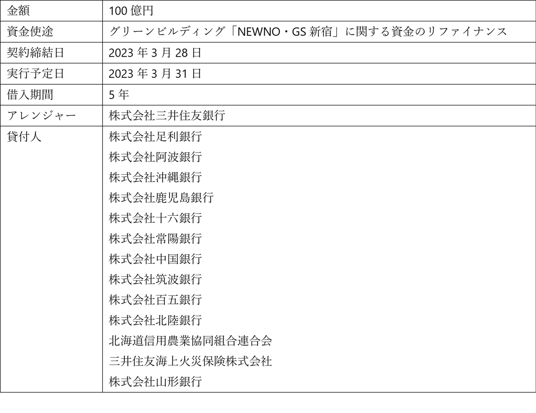 本ローン契約により調達した資金は、SMFLの戦略子会社、SMFLみらいパートナーズ株式会社(以下「SMFLみらいパートナーズ」)が所有するグリーンビルディング「NEWNO・GS新宿」に関する資金のリファイナンスに充当されます。 SMFLみらいパートナーズは、不動産ブランド「NEWNO」を通じて、事業領域を一層拡大・深化させるとともに、不動産の環境配慮やサービスの価値向上・強化を図ります。