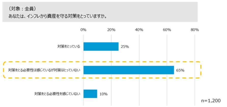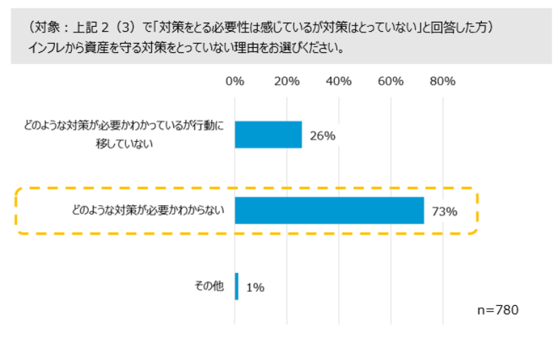 ✓ インフレから資産を守る「対策をとる必要性を感じているが対策はとっていない」方のうち、「どのような対策が必要かわからない」方が最多(73%)。