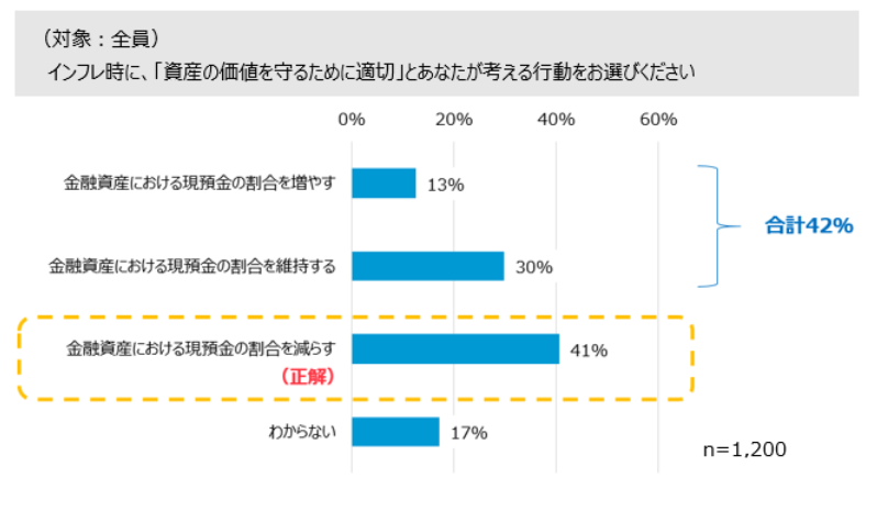 ✓ インフレ率よりも預金金利が低いと購買力(物やサービスを買う力)は低下する、と回答した割合(上記3(1)の正解率(74%))よりも、インフレ時に「現預金の割合を減らす」という回答率は低い(41%)。