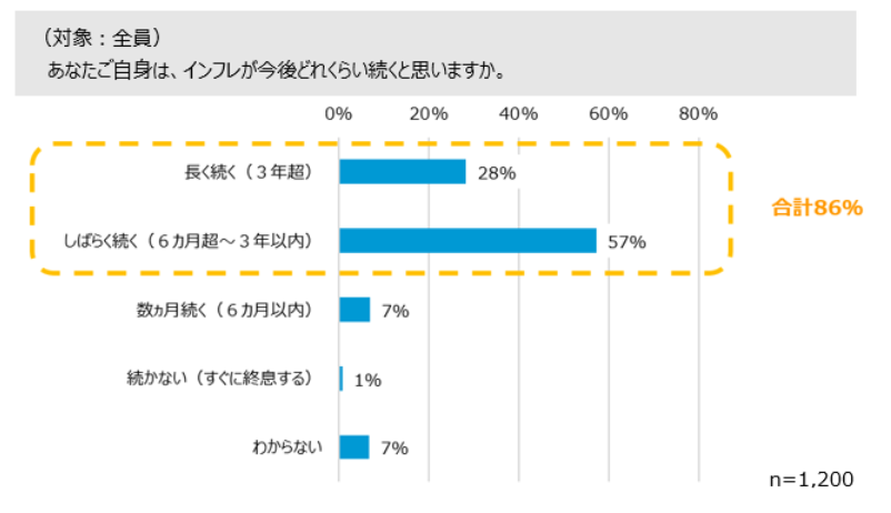 ✓ インフレは「長く続く(3年超)」「しばらく続く(6ヵ月超〜3年以内)」という回答は、合計で86%。