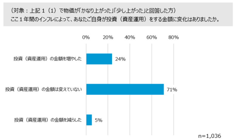 ✓ ここ1年間のインフレによって「投資(資産運用)の金額は変えていない」が最多(71%)。