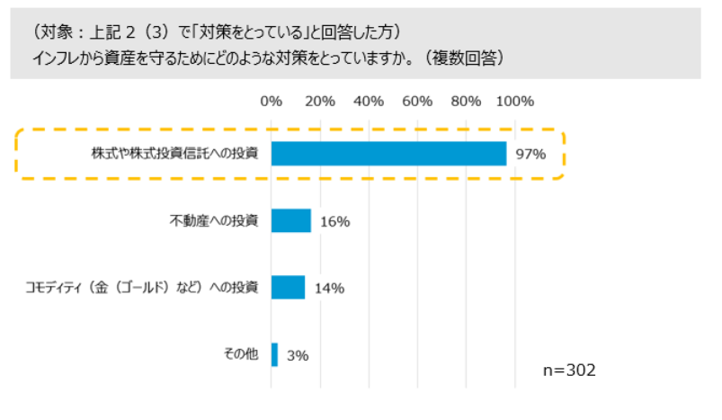✓ インフレから資産を守る対策をとっている方のうち、対策として最も多いのが「株式や株式投資信託への投資」(97%)。ほぼ全ての回答者が該当。