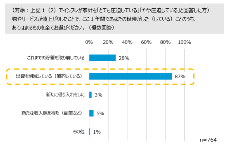 ✓ インフレが家計を圧迫していると回答した方のうち、「出費を削減している(節約している)」との回答が大半を占める(87%)。「これまでの貯蓄を取り崩している」(28%)方も比較的多い。