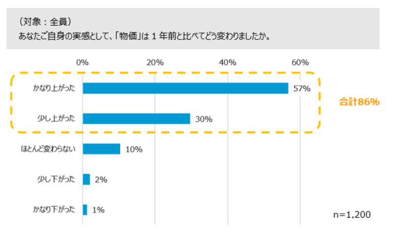 ✓ 「かなり上がった」「少し上がった」合計で86%。ほぼ全ての方がインフレを実感。