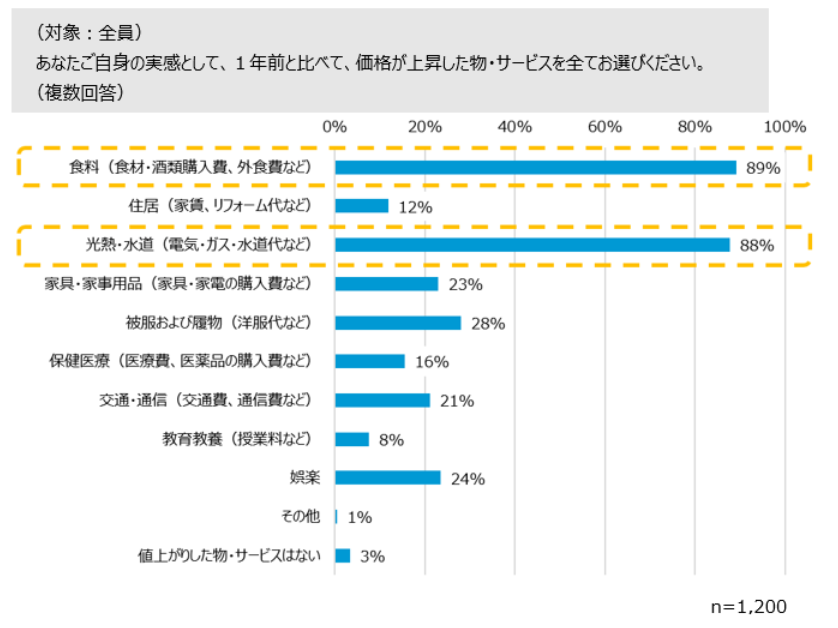 ✓ 「食料」(89%)、「光熱・⽔道」(88%)はほぼ全ての方が値上がりを実感。その割合は他の費目対比で際立っている。