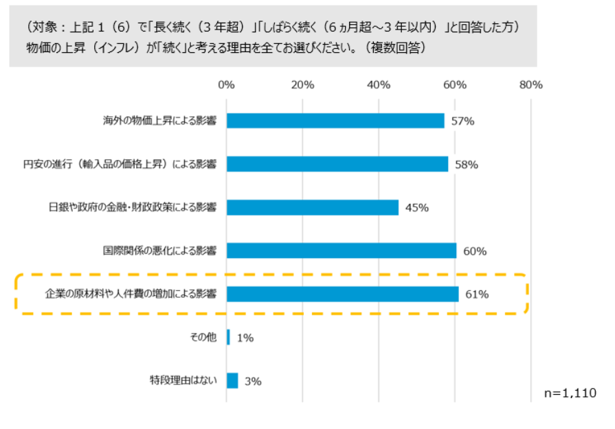 ✓ 「企業の原材料や人件費の増加」が最多(61%)。