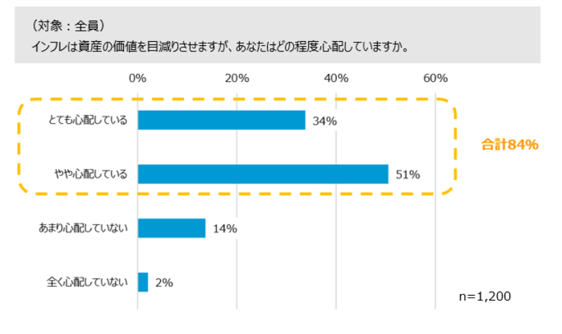 ✓ インフレが資産価値を目減りさせることを「とても心配している」「やや心配している」という回答は、合計で84%。