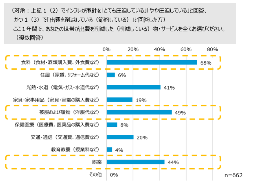 ✓ インフレで家計が圧迫されていると回答、かつ、出費を削減していると回答した方のうち、出費を削減した物・サービスの最多は「食料」(68%)。次いで、「被服および履物」(49%)、「娯楽」(44%)。