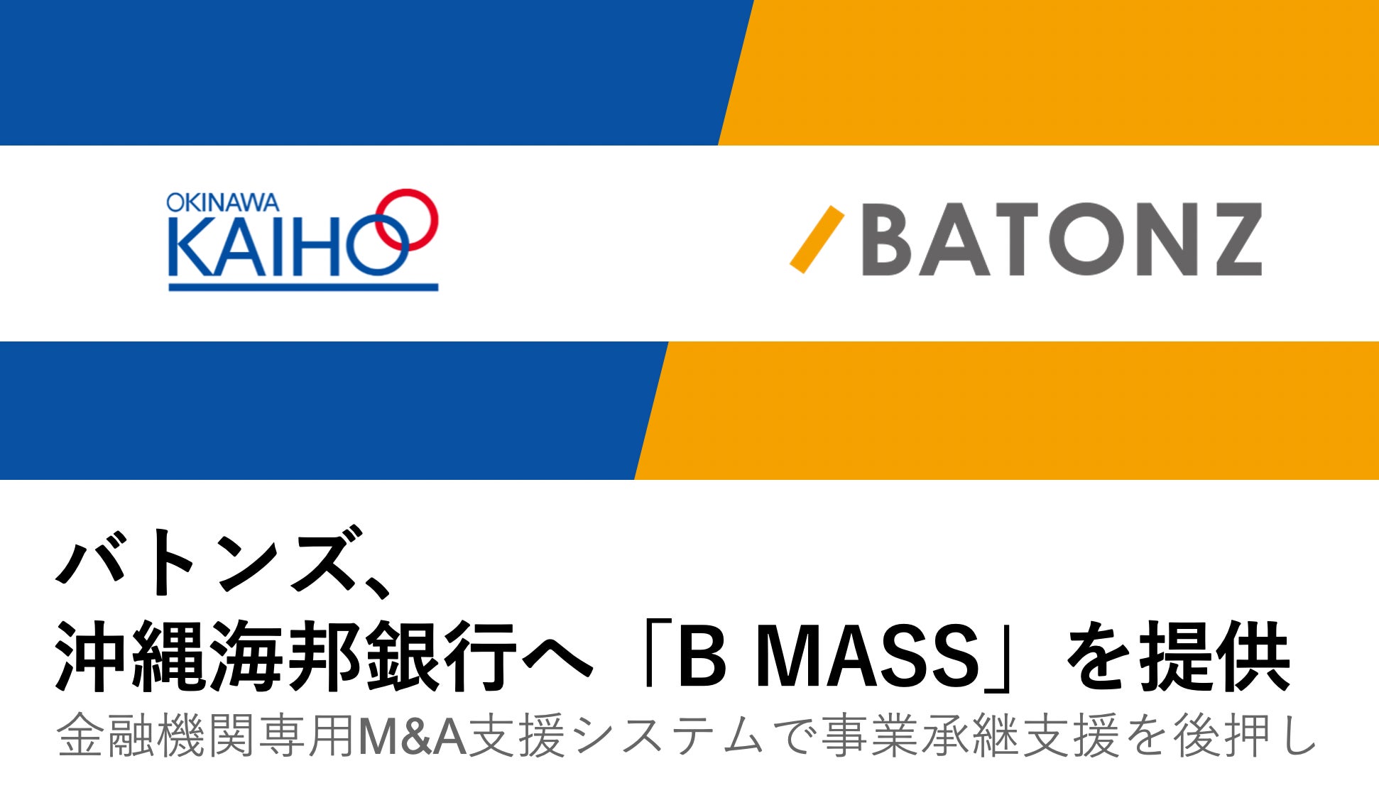 M&A総合支援プラットフォーム「BATONZ(バトンズ)」を運営する株式会社バトンズ(本社:東京都中央区、代表取締役:神瀬 悠一、以下バトンズ)は、株式会社沖縄海邦銀行(本社:沖縄県那覇市、代表取締役頭取:新城 一史、以下沖縄海邦銀行)へ金融機関専用M&A支援システム「B MASS(ビーマス)」(以下「B MASS」)の提供を開始したことをお知らせします。