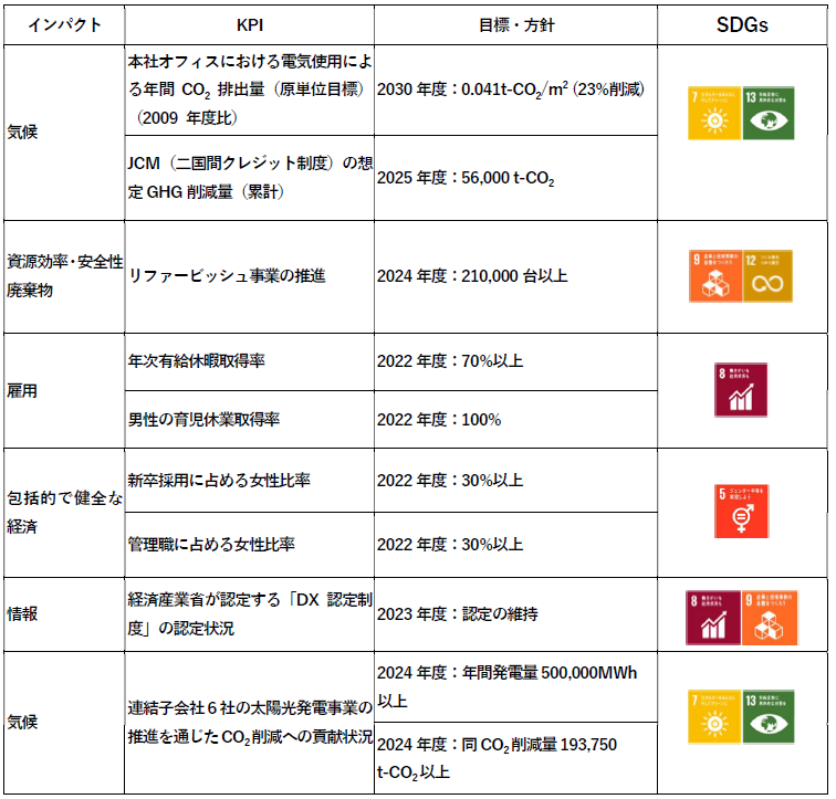本融資におけるKPI(Key Performance Indicator)は、SDGs の目標達成に対して「気候」、「資源効率・安全性」、「廃棄物」、「雇用」、「包括的で健全な経済」および「情報」の領域においてインパクトを与えると評価されました。なお、当該評価は株式会社日本格付研究所(JCR)より評価にかかるポジティブ・インパクト金融原則への適合性等について第三者意見(※2)を取得しております。
