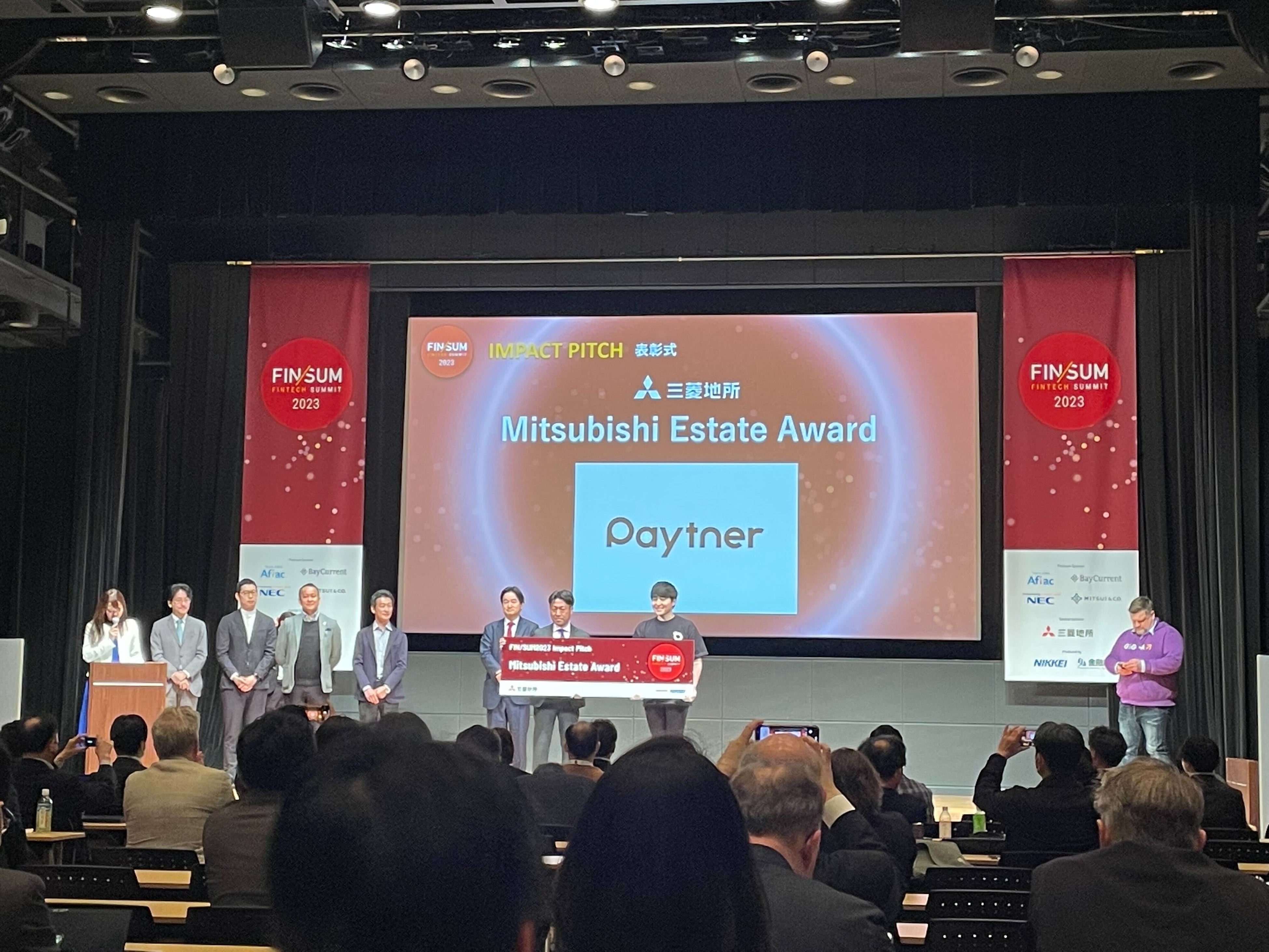 成長する全てのビジネスの、お金のストレスをなくすペイトナー株式会社(本社:東京都港区、代表取締役社長:阪井優、以下「ペイトナー(旧yup)」)は、日本経済新聞社、金融庁が主催するフィンテックのカンファレンス「FIN/SUM2023」に参加しました。同カンファレンス内にて3月31日(金)開催された社会課題解決型のスタートアップを対象とした「インパクトピッチ」にファイナリストとして代表取締役社長の阪井優が登壇し、「Mitsubishi Estate Award」を受賞しました。