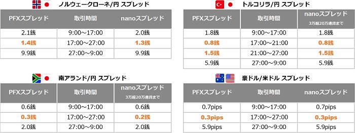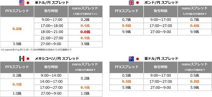 『パートナーズFXnano』では、キャンペーン時間のうち18時~21時の時間帯は、「米ドル/円」の1万100通貨~20万通貨までのお取引に対するスプレッドを0.0銭でご提供しております。原則固定(例外あり)業界最狭水準スプレッドでのお取引をご体感ください。