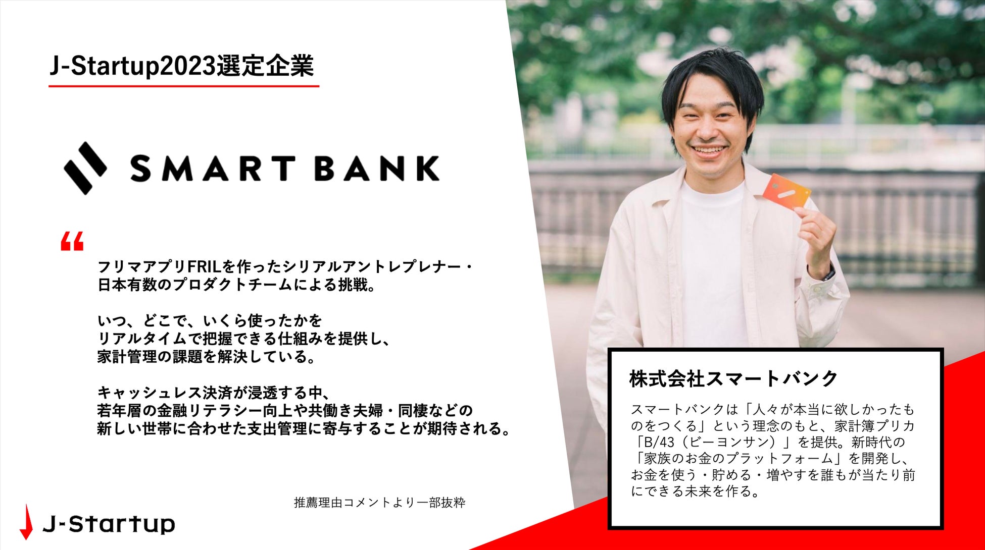 家計簿プリカ「B/43(ビーヨンサン)」を提供する株式会社スマートバンク(本社:東京都品川区、代表取締役:堀井 翔太、以下「当社」)は、経済産業省が推進するスタートアップ育成プログラム「 J-Startup 」において、J-Startupの第4次選定企業となったことをお知らせします。