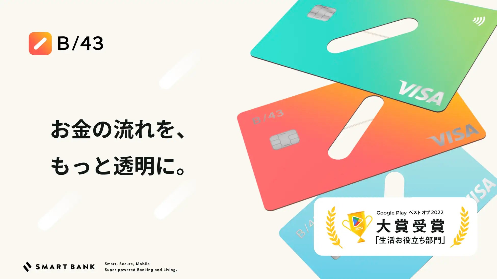 スマートバンクは、Visaプリペイドカードと家計簿アプリがセットになった新しい家計管理サービス「B/43(ビーヨンサン)」を提供しています。夫婦や同棲カップル向けの「B/43ペアカード(特許出願中)」では、ふたりで使える専用カードと共有口座を作ることができます。また、親子向けの「B/43ジュニアカード」ではキャッシュレスでお小遣いを渡し、親子で一緒にお金の管理ができます。新時代の「家族のお金のプラットフォーム」を開発し、お金を使う・貯める・増やすを誰もが当たり前にできる未来を作ります。