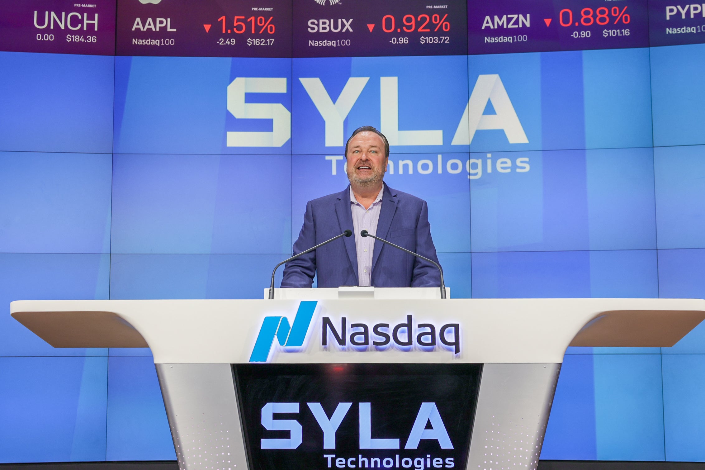 上場セレモニーでは、Nasdaq Senior Exective HostのDavid Wicks氏が登壇し、日本一のクラウドファンディングサービスを展開するシーラテクノロジーズが、世界一を目指す第一歩としてナスダック市場へ上場することに対して、祝辞を述べました。その後、シーラテクノロジーズ 代表取締役会長 兼 CEO杉本宏之による代表挨拶とベルセレモニーを行いました。