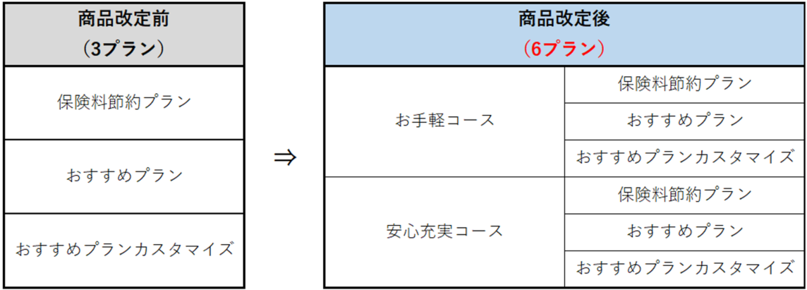 今回の改定により、保険料を安く抑えた「お手軽コース」と手厚い補償やサービスを提供する「安心充実コース」の2コースを設け、それぞれ「保険料節約プラン」「おすすめプラン」「おすすめプランカスタマイズ」の3プランを用意することで、計6プランからお選びいただけるようにしました。