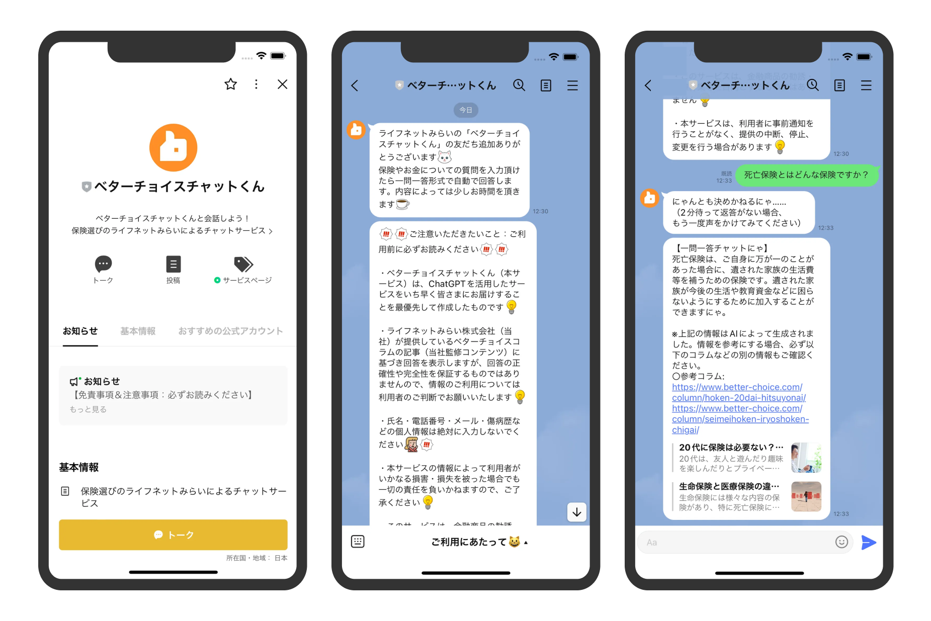 ライフネット生命保険株式会社のグループ会社で保険選びサイト「betterChoice(ベターチョイス)、URL: https://www.better-choice.com」(以下、「ベターチョイス」)を運営するライフネットみらい株式会社(本社:東京都千代田区、代表取締役社長:金杉貴仁、以下、「ライフネットみらい」)は、OpenAI社が提供するChatGPT(GPT-3.5)のAPIを活用してLINE上でお客さまの質問に、自社監修のコラム記事を用いて自動で回答するサービス、「ベターチョイスチャットくん」*1を公開したことをお知らせします。ChatGPT(GPT-3.5)と自社サイトの記事をAPI連携し、LINEを用いたサービスは業界初*2の事例となります。自社サイトの記事という限定的な情報を連携してGPT-3.5モデルが回答を作成していることから、回答する情報については必ずしも正確性や完全性の保証はできませんが、今後も新しい技術の活用によってより良いサービスをお客さまにお届けするための挑戦的な取り組みになります。