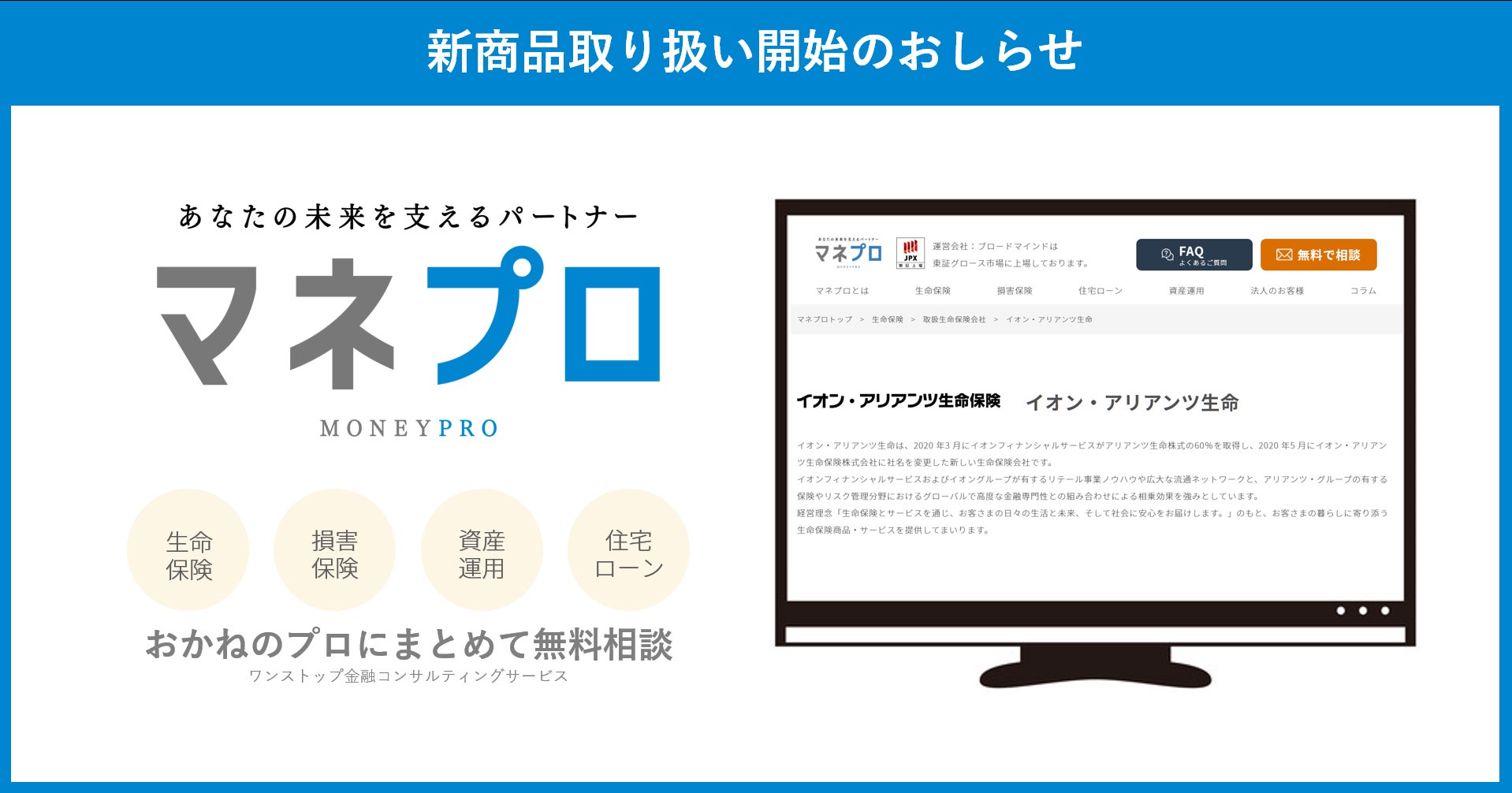 「金融の力を解き放つ」をパーパスに掲げ、保険・証券・住宅ローンと複数の金融商品を横断して1社で取り扱い、人々のライフプラン実現をサポートするブロードマインド株式会社(本社:東京都渋谷区 代表取締役社長:伊藤清 証券コード:7343 以下:当社)は、あらゆる年代のお客様に対しライフステージに応じた金融商品をワンストップで提供するコンサルティングサービス『マネプロ』を提供していますが、本日よりイオン・アリアンツ生命保険株式会社の商品の取り扱いを開始しました。今後もお客様の様々なニーズにお応えできるよう、商品・サービスを拡充してまいります。