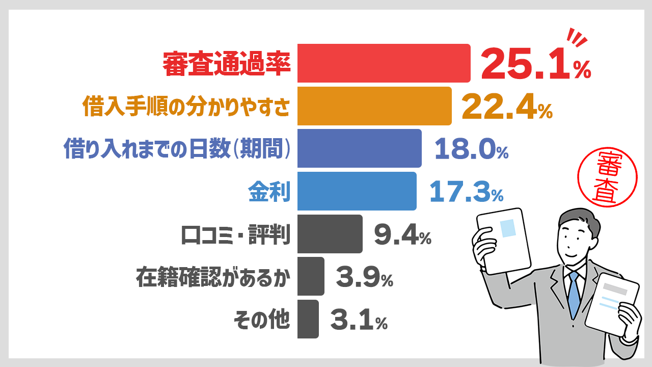 この結果を見ると、審査への不安だけでなく、借入手順の簡単さや融資スピード、金利まで、