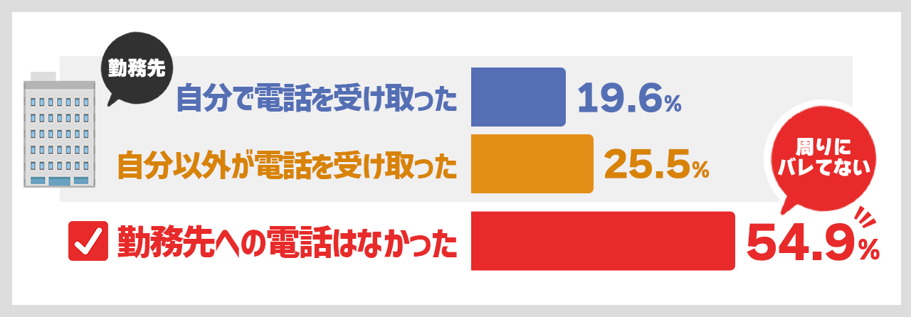 続いて「勤務先に電話があり、自分以外が電話を受け取った」が25.5%、「勤務先に電話があり、自分で電話を受け取った」が19.6%となっています。