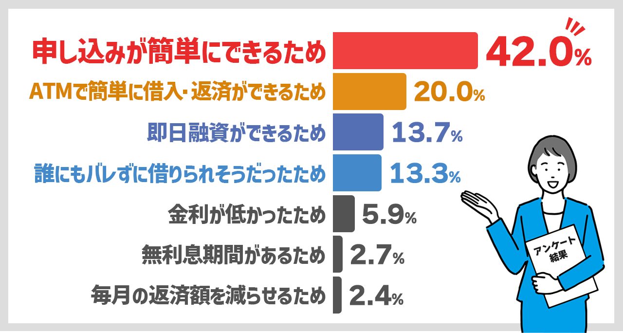 この結果から、カードローンを借入する際は手間がかからず、楽に借り入れできる点が重視されていると分かります。