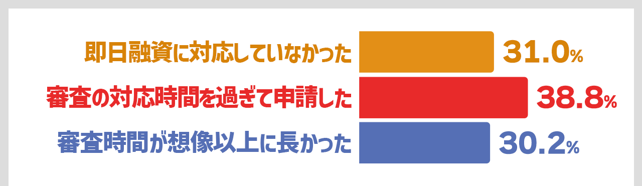 続いて「業者が即日融資に対応していなかった」が31.0%、「審査時間が想像以上に長かった」が30.2%と続いています。