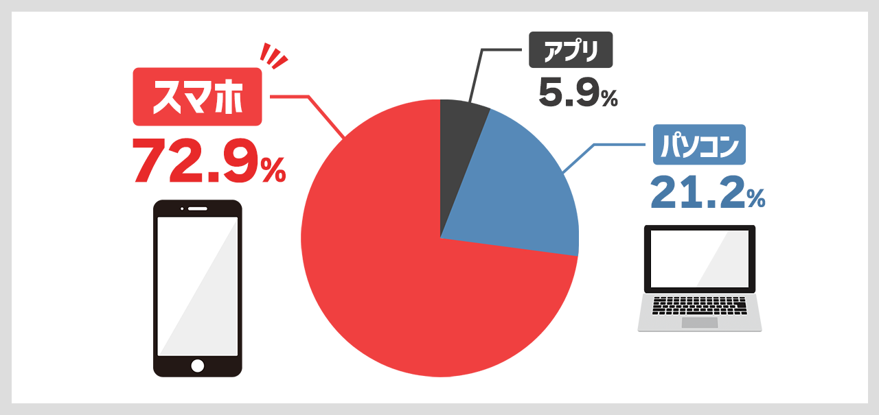 アンケート結果によると、カードローンの申し込み方法において、スマートフォンが72.9%と最も利用されていることが明らかになりました。次いで21.2%がパソコン、5.9%がアプリで申し込んだと回答しています。