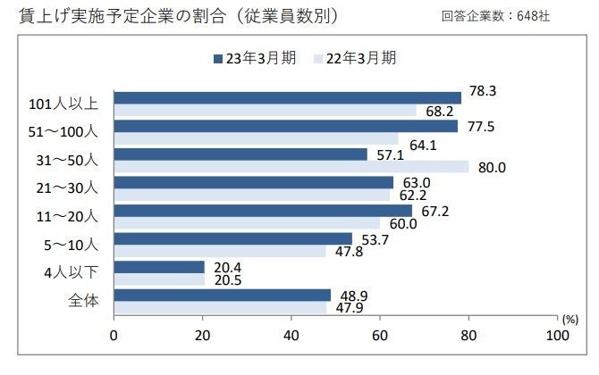 賃上げを「実施する」は48.9%と前年調査から1.0ポイント上昇しました。業績が十分に回復していない現状でも賃上げを取り組まざるを得ないのが実情です。