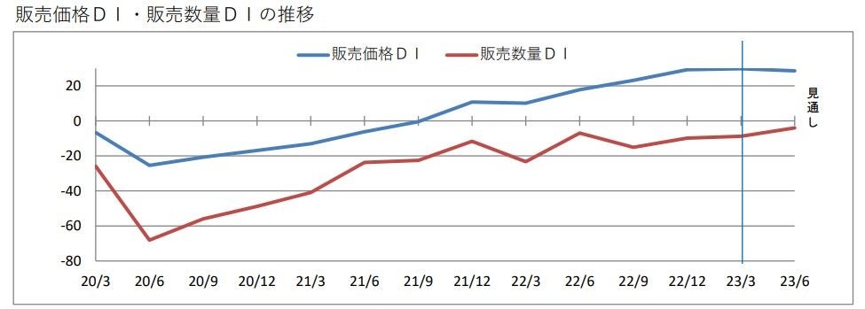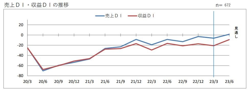 2023年4-6月期は、売上DIが7.7ポイント、収益DIが11.9ポイント上昇すると予想しており、5月8日から新型コロナウイルスの感染法上の分類が5類に変更されることや、賃上げ機運の高まりを背景に、業況の回復に大きな期待を寄せています。