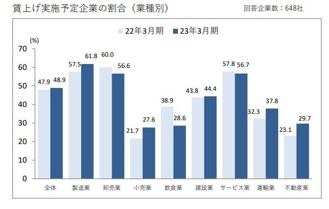 特に、製造業は61.8%(前年比+4.3ポイント)、建設業は44.4%(前年比+0.6ポイント)、運輸業は37.8%(前年比+5.5ポイント)となり、賃上げに積極的な企業が増加しています。また、ベースアップ予定額は「5,000円以上」34.0%(前年比+13.6ポイント)、定期昇給予定額は「5,000円以上」が32.2%(前年比+13.7ポイント)となり、金額ベースでも苦渋の決断をしていると思われます。