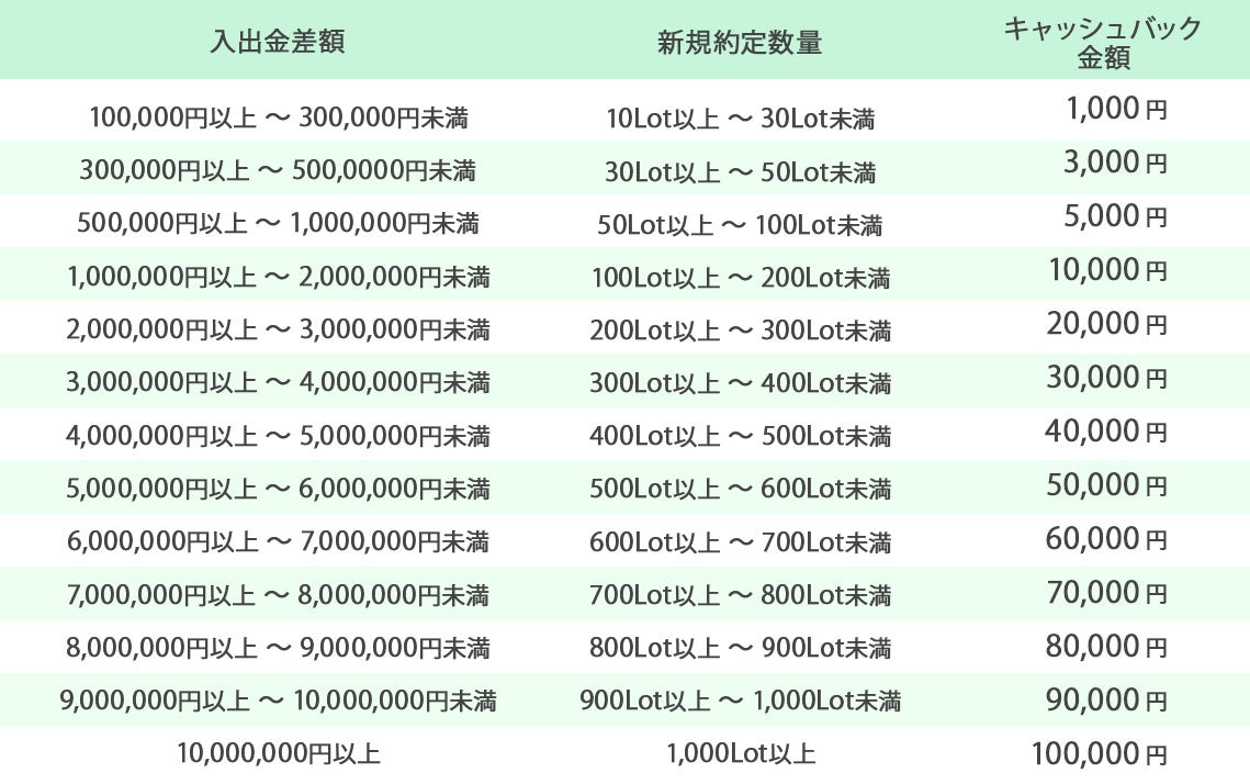 2023年4月17日(月)~2023年7月14日(金)の期間中、お客様の入出金差額※、「みんなのFX」および「LIGHT FX」の新規約定数量に応じて、下表の通り入出金差額の最大1%をキャッシュバックいたします(上限10万円)。