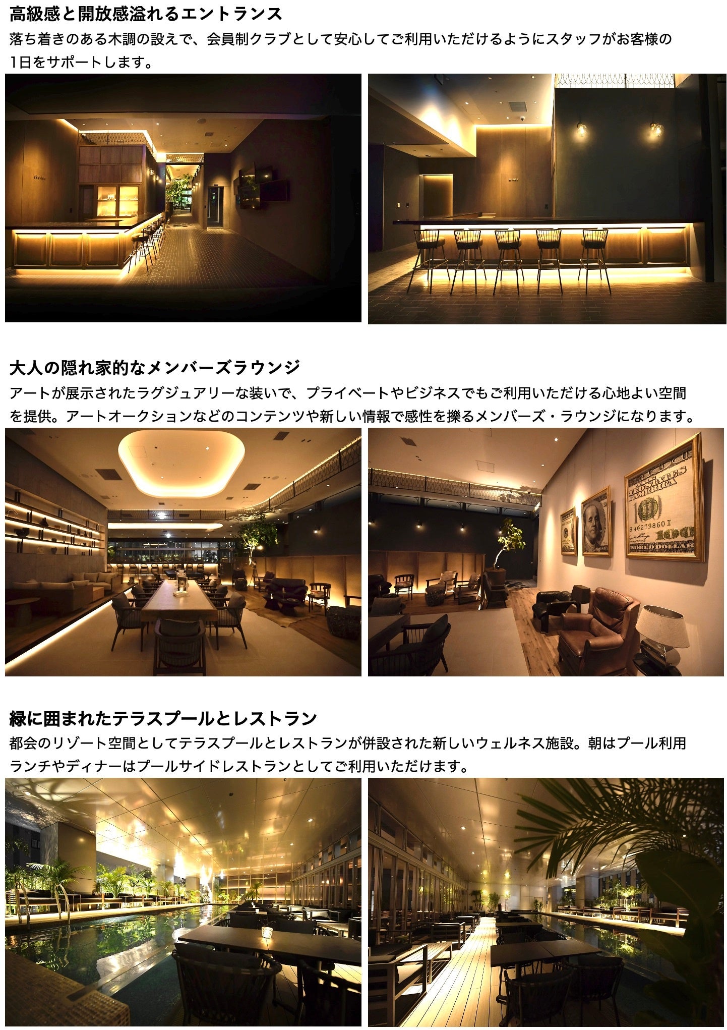 美と健康をテーマにしたラグジュアリーなウェルネス空間と、上質な食事とお酒を味わえるホスピタリティ高いサービスを有する至高のウェルビーイング施設です。自然体でありのままの自分でいられる唯一無二の空間として、都会にありながらも、リゾートのような空間を演出しており、日常から離れゆったりとした時間を過ごすことができます。