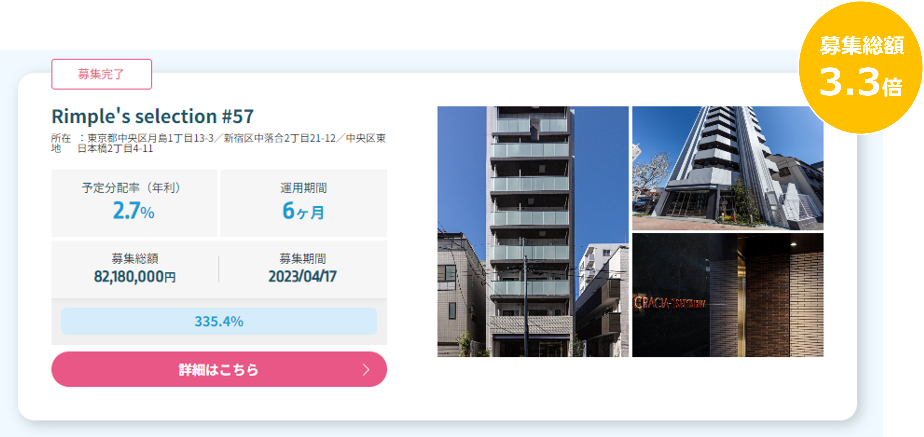 「DX」と「不動産」で価値を創造する企業、プロパティエージェント株式会社(本社:東京都新宿区、代表取締役社長:中西 聖、証券コード:3464)が運営する不動産特定共同事業法に基づく不動産投資型クラウドファンディングサービス「Rimple(リンプル)」(以下、「Rimple」)において、Rimple’s Selection#57に、2億7,566万円のご応募をいただきました。これは、募集金額8,218万円(出資総額1億1,740万円うち優先出資70%分)に対し335.4%となります。
