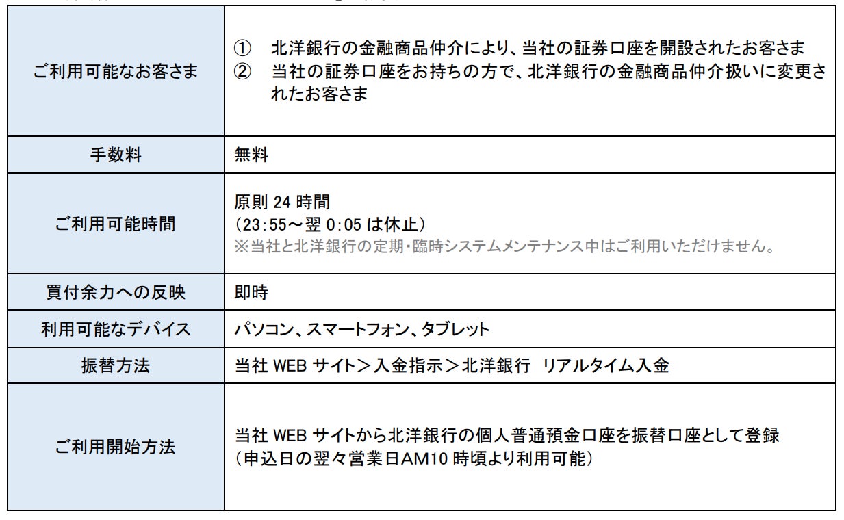 「北洋銀行 リアルタイム入金」は、北洋銀行の個人普通預金口座をお持ちで、北洋銀行の金融商品仲介のお客さまが、当社WEBサイトより振替口座のご登録後、振込指示を行うことで、即時に手数料無料で当社証券総合口座に買付余力として反映できるサービスです。振替口座登録から振込指示まで、当社WEBサイト内にて完結します。
