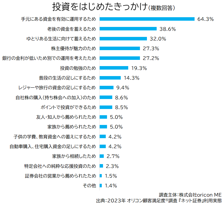 ネット証券の利用者4,852名に、「あなたが投資をはじめたきっかけ」を複数回答で聴取した結果、「手元にある資金を有効に運用するため」が64.3%と最多になりました。