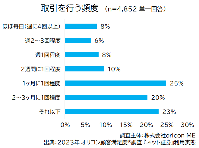 週に1回程度以上(「ほぼ毎日(週に4回以上)」「週に2~3回程度」「週1回程度」の合計)も22%となっており、取引頻度に関しては広く分かれる傾向となりました。