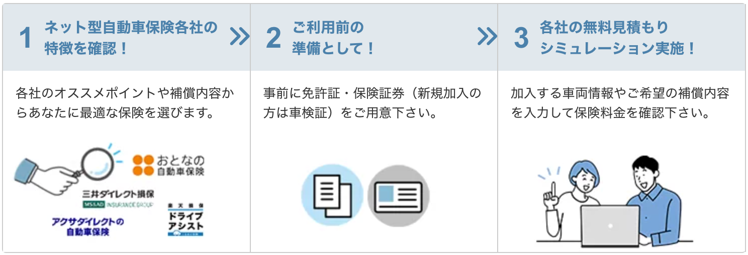 人気自動車保険4社から、保険料や補償内容を比較できる機能をはじめ、自動車保険の基礎知識や事故対応の情報など、保険選びに有益なコラムを随時更新しています。見積もりから申し込みまでインターネットで完結するため、便利にご利用頂けます。
