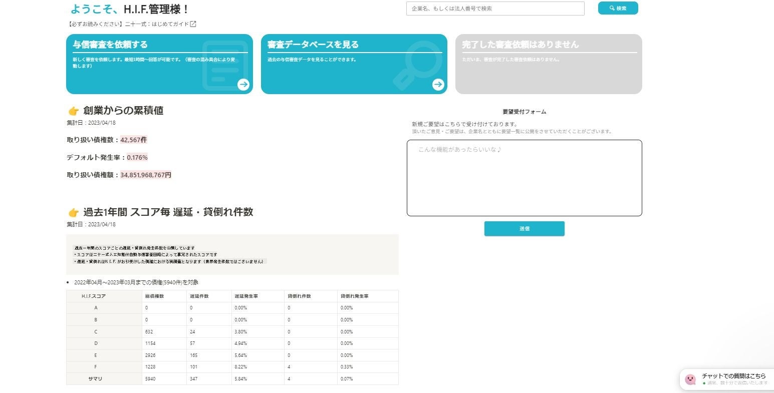 H.I.F.が過去に審査した企業とその与信データの一部を自由に閲覧いただけます。