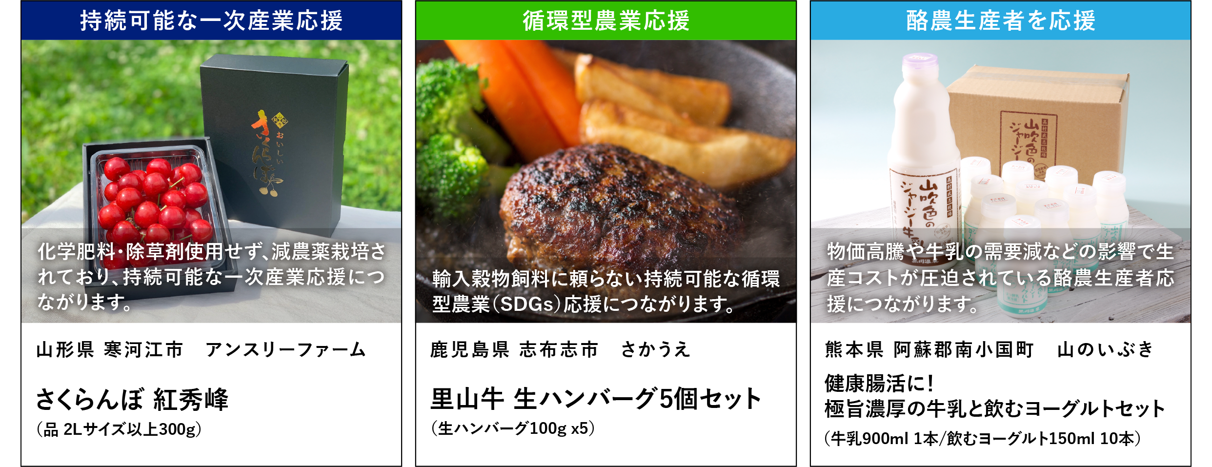 本プログラムにてお客様へプレゼントする食材は、SDGsに貢献する生産者の食材を活用するとともに、生産者支援を目的として事前に注文確約やオーナー契約を行った食材となります。本プログラムを通じて農作物の計画的な栽培と生産現場での食品ロス削減へ貢献すると同時に、季節や気象条件、天候の変化などによって生産量や品質に大きな影響を受けやすい農作物の外的環境による価格変動のリスクヘッジへ繋げ、SDGsへ貢献する生産者や環境保全型農業を応援いたします。また、自然災害などで被災された生産者や、物価高騰の影響で経営状況が悪化し支援を必要とする生産者などの食材を積極的に購入し本プログラムに活用することで、有事の際も生産者が経営を安定して継続できる環境づくりをサポートいたします。