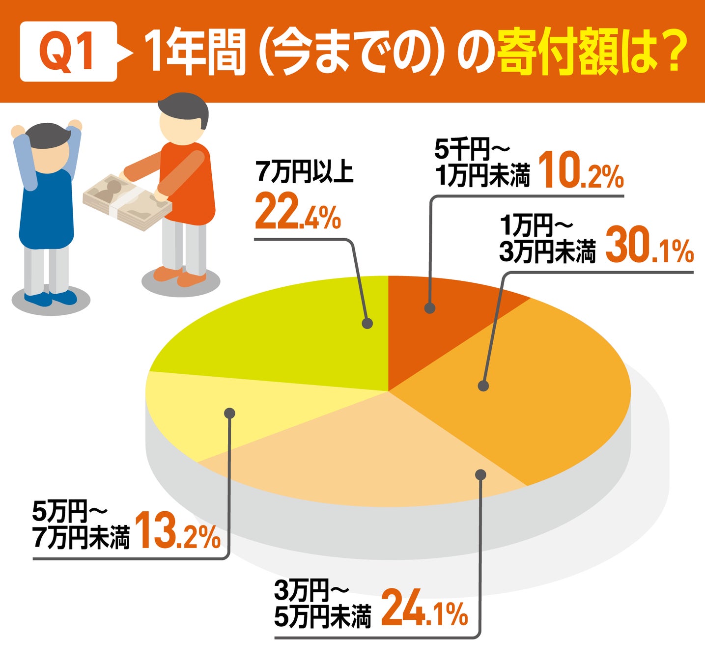 寄付額が「1万円~3万円未満」の人が最も多く、1万円未満と合わせると寄付額は3万円未満という人が全体の約40%でした。