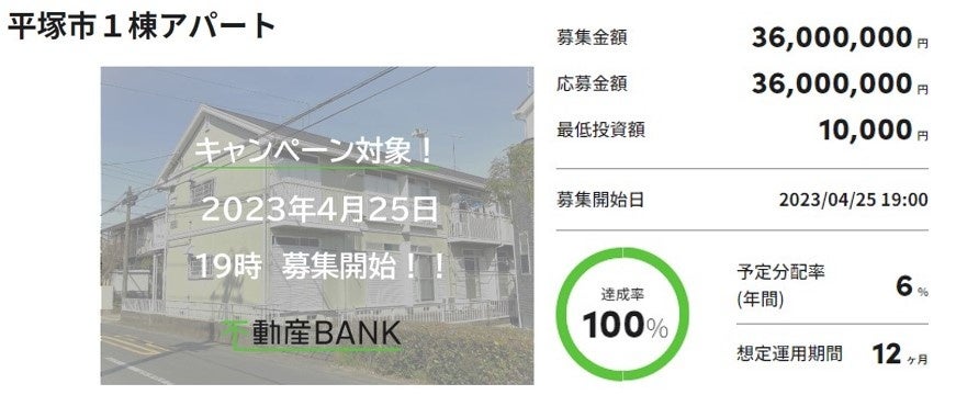 本ファンドは、東海道線の「平塚」駅を最寄り駅とする賃貸需要が高いエリアの物件で、株式会社ファミリーコーポレーションが運営する「不動産BANK」を通じて、4月25日から募集を開始し、10分で完売となりました。