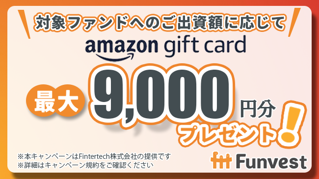 また、本ファンドへの出資額に応じて最大9,000円分のAmazonギフトカードをプレゼントするキャンペーンを併せて実施いたします。
