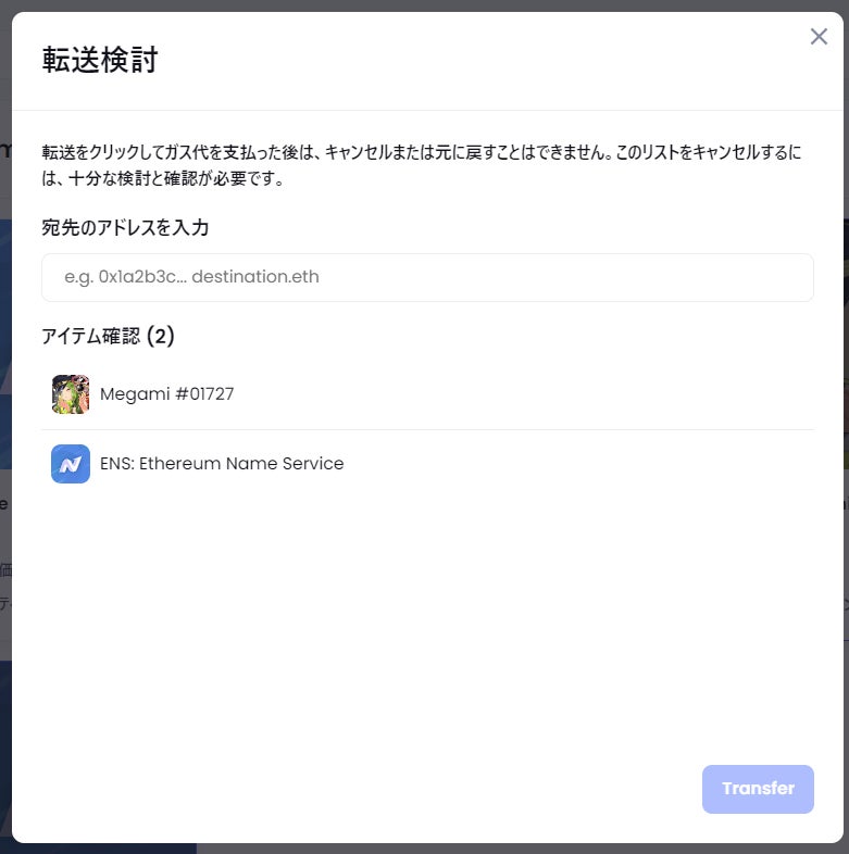 販売機能と同一で、一括転送することによりブロックチェーンの使用手数料(通称:ガス代)をユーザーが節約することができます。