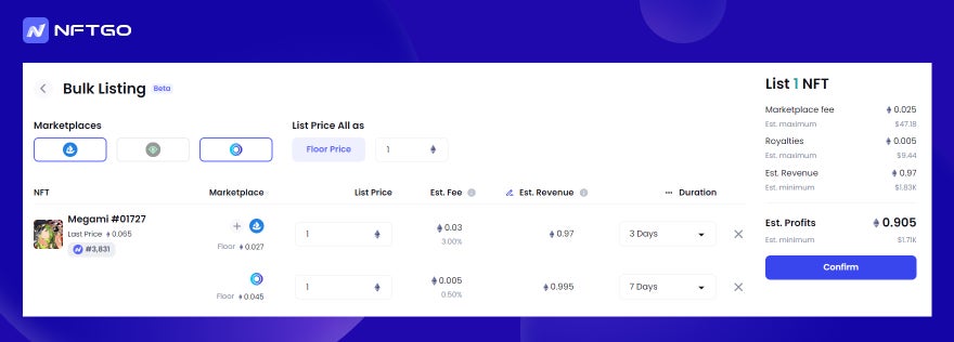 NFTGoにて自身の暗号資産ウォレットを接続すると、マイページから自身の保有するNFTの一覧が閲覧できます。販売したいNFTを選択し販売設定画面に移動すると販売先のマーケットプレイス、販売(リスト)価格、販売期間を設定すると、各マーケットプレイスの手数料率から算定された手数料、収益値の見積りが表示されます。