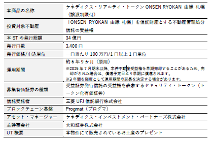 この度、その第5弾として、資産規模77.2億円の札幌市中心部にある都市型旅館を裏付け資産とし、発行総額が34億円となる不動産STOによる資金調達を完了し、「ケネディクス・リアルティ・トークンONSEN RYOKAN 由縁 札幌(譲渡制限付)(以下「本ST」)」の運用を開始したことをお知らせいたします。