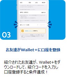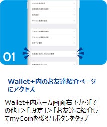 Wallet+を家族やお友達に紹介し、紹介された方がダウンロード&口座登録までされると、「紹介した方」「紹介された方」それぞれに500円相当のmyCoinをプレゼント!