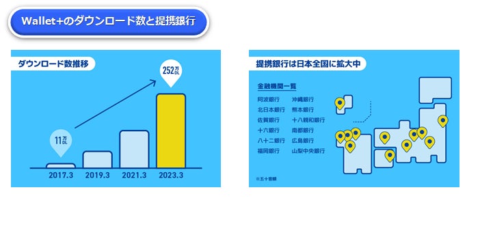 2016年7月のサービス開始以降、『Wallet+』のダウンロード数は年々加速し、約7年で250万ダウンロードを突破いたしました。また、今春、北日本銀行と阿波銀行においてサービスを開始し、提携銀行は計12行と全国に拡大しています。