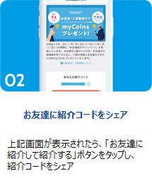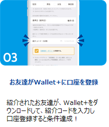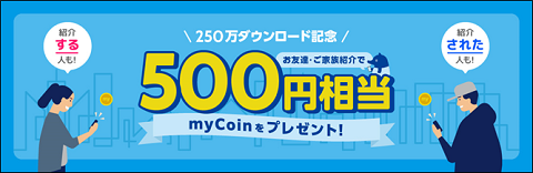 Wallet+を家族やお友達に紹介し、紹介された方がダウンロード&口座登録までされると、「紹介した方」「紹介された方」それぞれに500円相当のmyCoinをプレゼント!