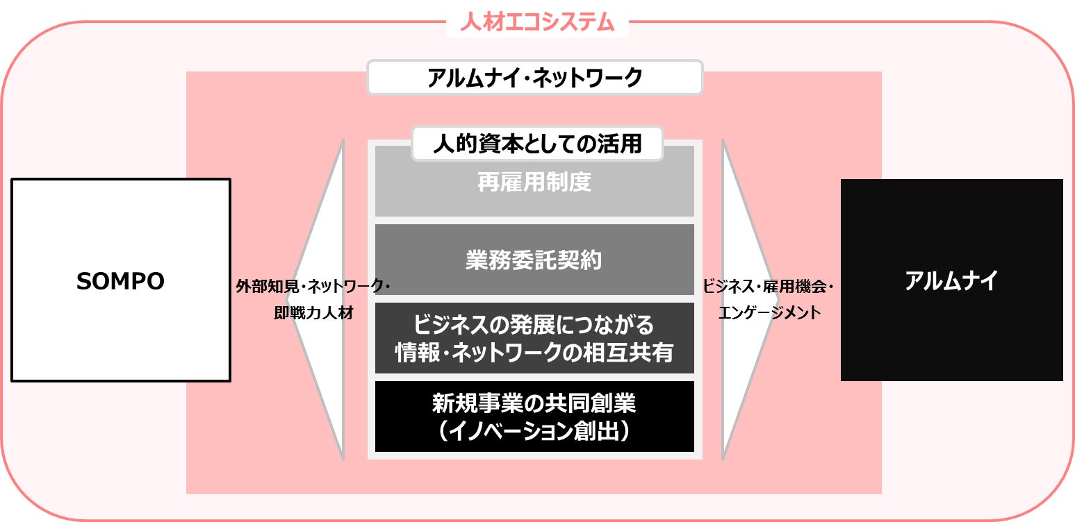 SOMPOグループおよびアルムナイ同士のネットワークの構築、SOMPOグループへの再入社をはじめとしたキャリアの選択肢の拡大など。 |